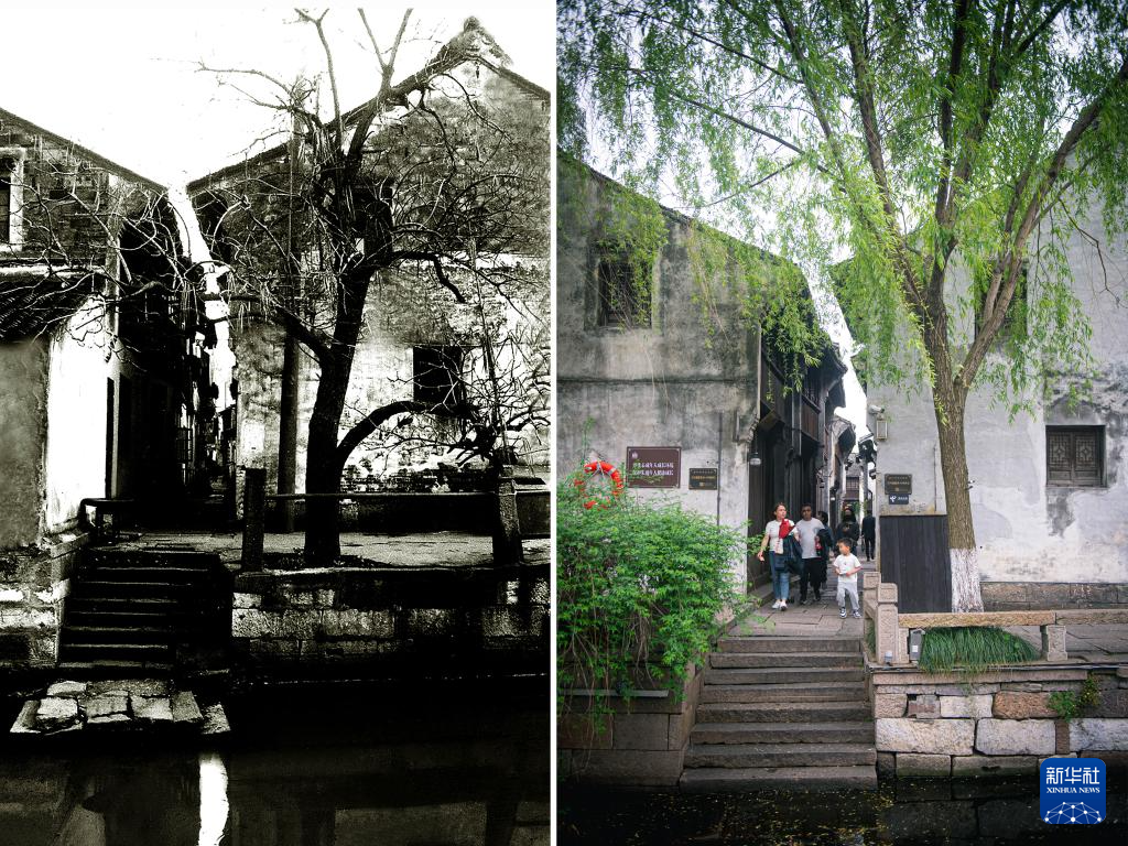 拼版照片:上图为1979年的嘉兴市月河历史街区小猪廊下(资料照片,庞艺影摄);下图为4月26日拍摄的嘉兴市月河历史街区小猪廊下(新华社记者江汉摄)。