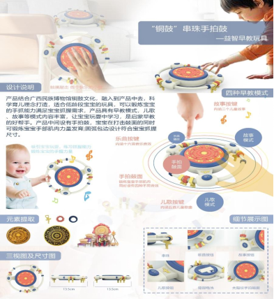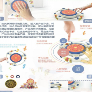 设计说明:产品结合广西民族博物馆铜鼓文化,将其融入到产品中去,利用科学育儿理念打造适合低龄段宝宝的玩具,可以锻炼宝宝的手抓能力,满足宝宝抓握需求。产品具有早教模式、儿歌、故事等模,式内容丰富,让宝宝在玩耍中学习,是启蒙早教的好帮手。产品中间设有手拍鼓,宝宝在打击鼓面的同时可锻炼手部肌肉力量发育,圆弧包边设计符合宝宝抓握尺寸。