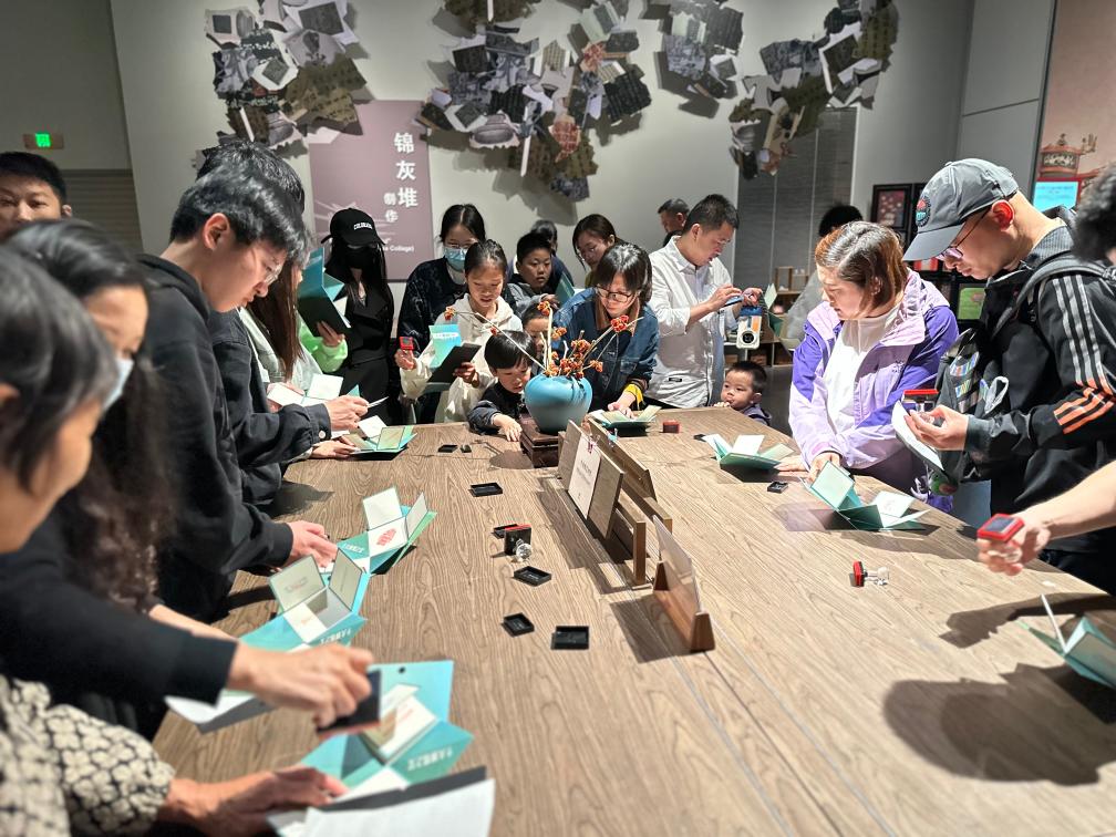 拓印微缩的“良渚玉琮王”,滚印河姆渡牙雕上的双鸟纹……用集章的方式将十大镇馆之宝带回家,5月1日,浙江省博物馆之江馆负一层的人文探索馆里,不少观众纷纷前来感受精品文物的魅力。