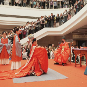 配合展览,“五一”假期,该馆精心推出明代婚礼展演,从舞台、屏风、华服等元素尽力贴近明代风韵,展示新婿新妇携手行拜堂之礼,以全新方式引领公众探寻传统文化的魅力。武汉博物馆馆长任晓飞说,博物馆承载着华夏礼仪文化,如今到博物馆追寻历史已成为年轻人的一种时尚,展演营造出身临其境的参观体验,有助于拉近博物馆与观众之间的距离。