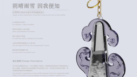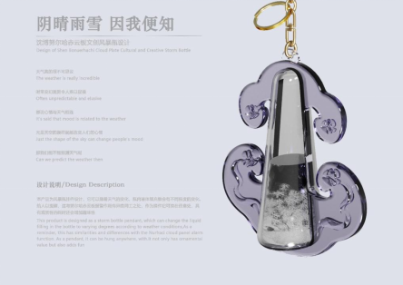 设计说明:本产品为风暴瓶挂件设计,它可以随着天气的变化,瓶内液体填充物会有不同程度的变化,给人以提醒,这与努尔哈赤云板报警作用有异曲同工之处,作为挂件它可挂在任意处,既有观赏性又有趣味性。