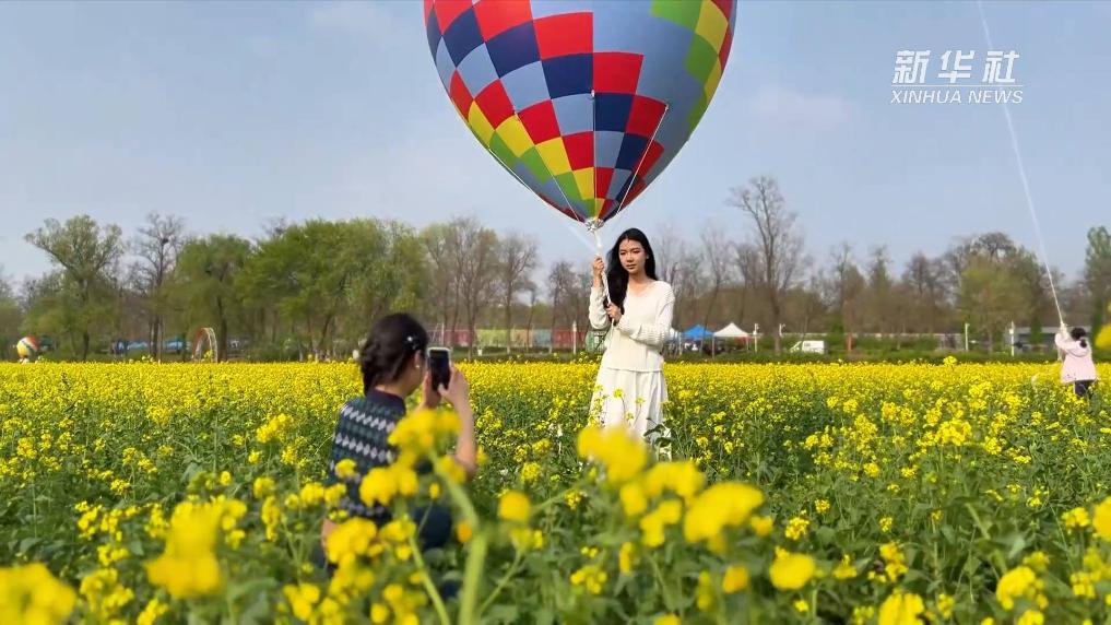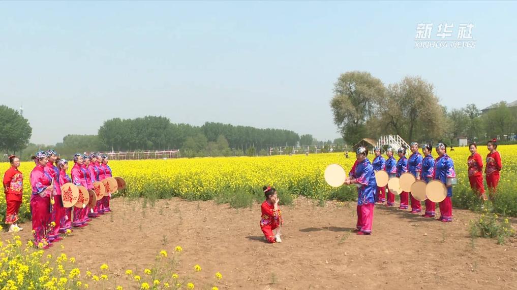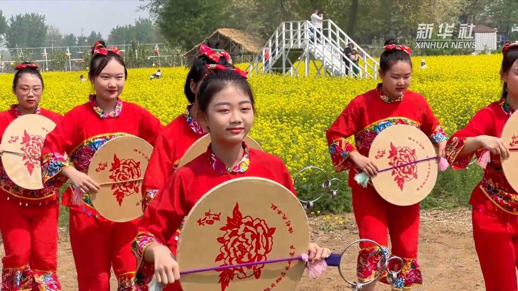 怪村百亩油菜花田近日盛开。花开时节,村民们在美不胜收的花海中敲响太平鼓,阵阵鼓声为油菜花海增添无限魅力,吸引众多游客赏花游玩,拍照留念。
