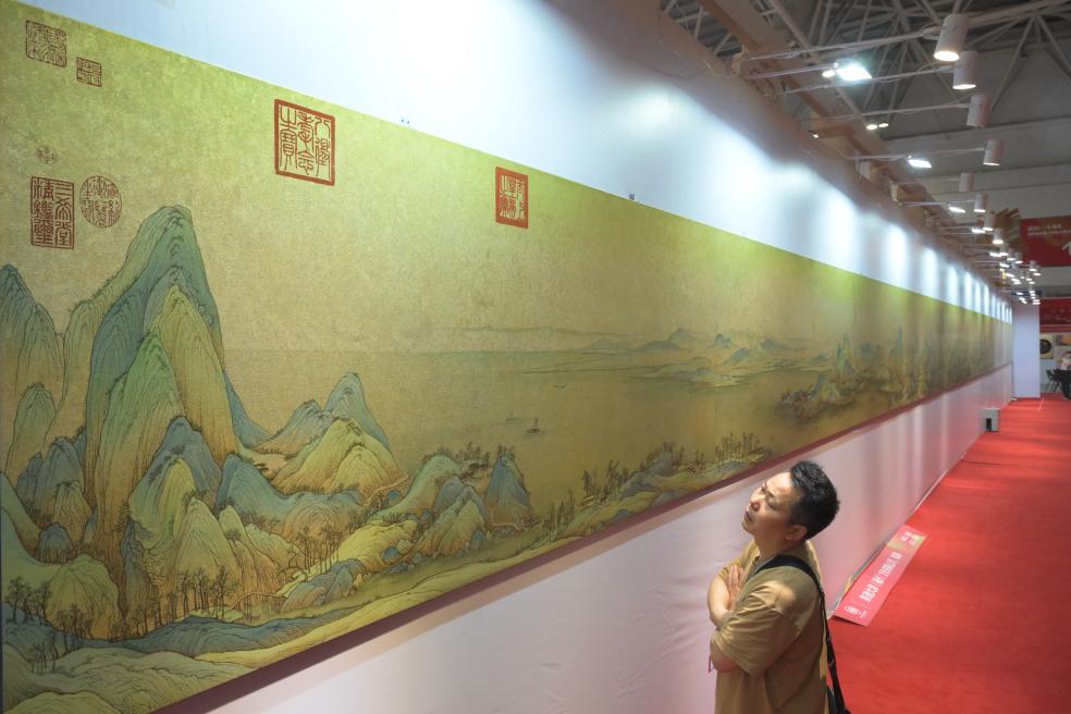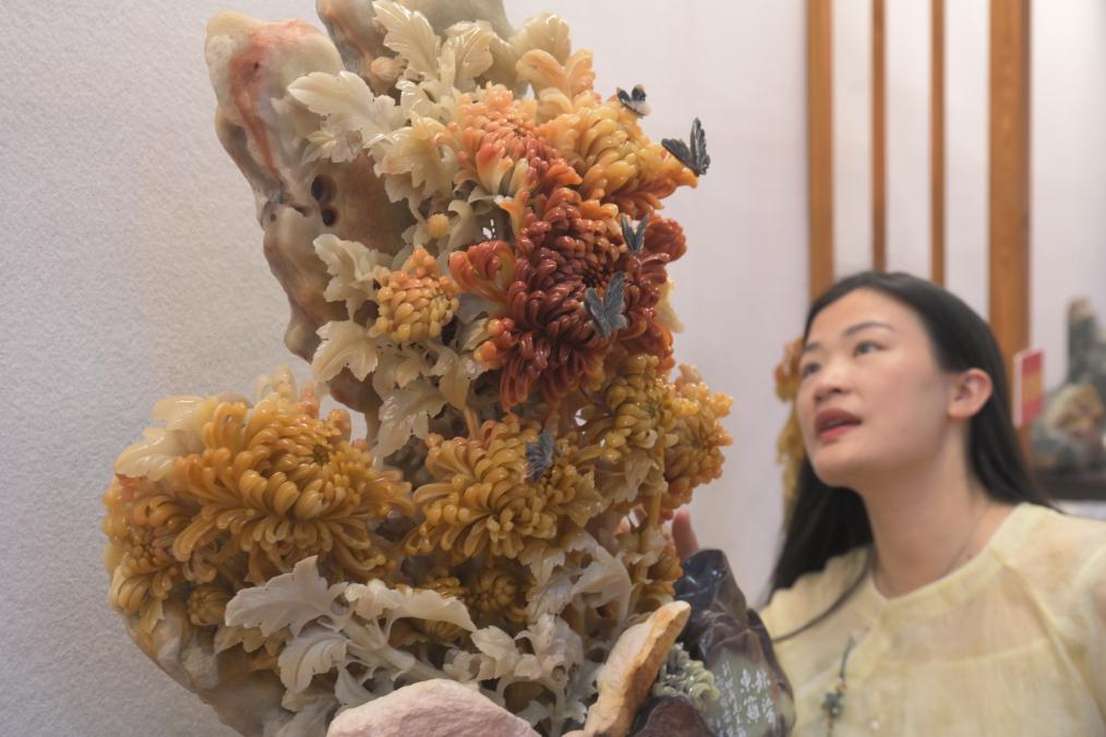 5月10日,参观者在博览会上欣赏雕刻作品。