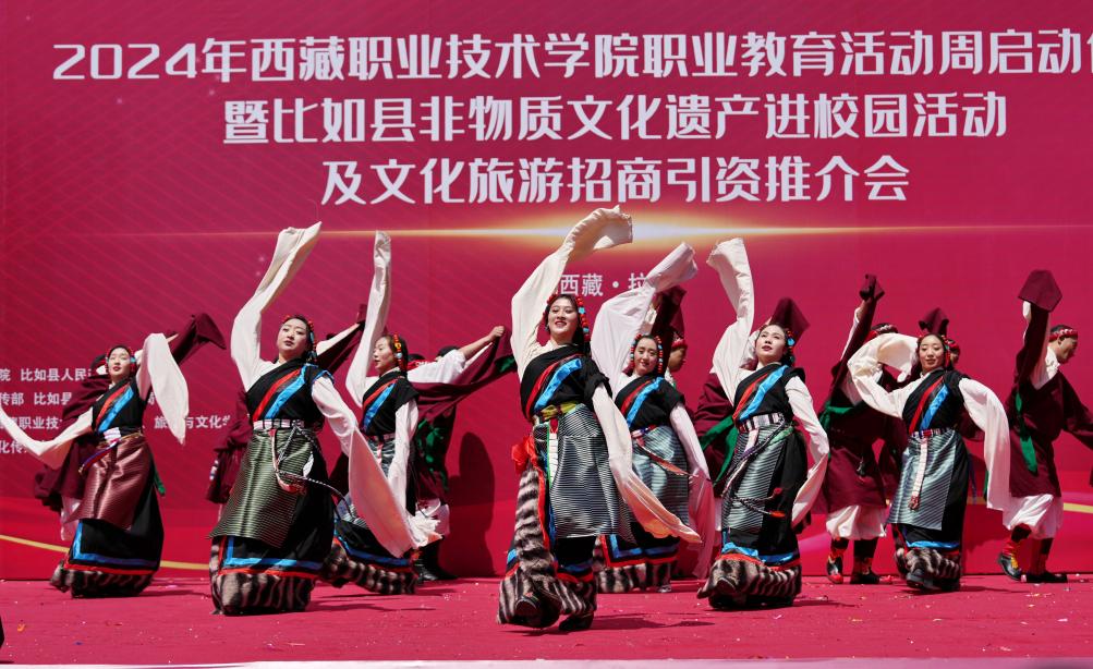 当日,西藏职业技术学院职业教育活动周在拉萨启动,那曲市比如县民族艺术团非物质文化遗产表演暨“乡村振兴 那曲奋进”旅游推介走进校园,激发人们对传统文化和特色旅游的兴趣。