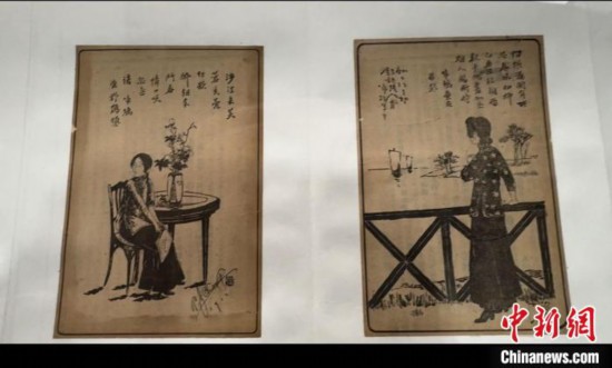 现场展出的《民国日报》(上海版)上刊载的张大千“啼鹃”款人物画。 中新社记者 许婧 摄