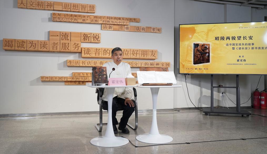 12日在三联韬奋书店举行的新书首发式上,中国国家博物馆研究馆员、国博研究院副院长、本书作者霍宏伟为读者讲述了唐代昭陵石骏的千古传奇,溯源追踪昭陵两骏飒露紫和拳毛䯄离家的故事,解析历史文物之美。