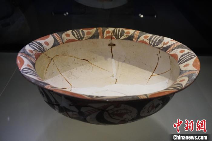 除了口径大,这件白衣彩陶盆还十分精美,其通体施白釉,犹如给器物“穿上”白衣,在白釉之上,先民们用鲜艳的颜色绘制了丰富的图案。在白衣彩陶盆的口沿处,有8组直线纹组成的对称图案,其腹部也有4组由方格纹和圆点纹组成的对称图案。“从这里可以看出,古人已有了对称等分的概念。”胡继忠介绍说。