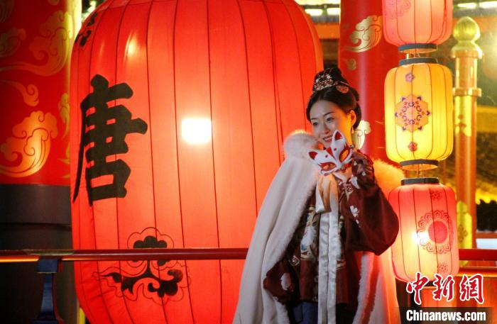 2023年1月14日,汉服爱好者在大唐芙蓉园内打卡拍照。 中新社记者 张一辰 摄