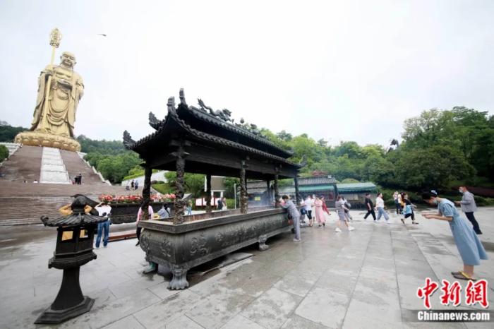游客在安徽池州九华山大愿文化园里参拜99米高地藏菩萨像。李青松 摄