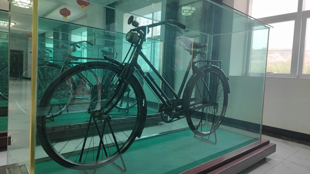 甘肃三木自行车博物馆内同样令人印象深刻的是一辆“红马”牌国产自行车。这辆自行车车身约长190厘米,坐垫至地面距离约95厘米,车把至地面约100厘米,轮径71厘米,整体结构看上去和“二八大杠”并无二致。
