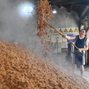 在拥有1600口老窖池的剑南春8号车间,车间主任罗嘉钜正在指挥出甑取酒。从粮食到出酒,前后要经历267道大小工序。“本来35天左右粮食就能发酵生成为酒,但是为了保证优秀的品质,我们坚持70余天酿造,加倍付出了时间,牺牲了产量。”罗嘉钜说,厂里像他这样的老师傅有400余位,一对一带徒弟出师至少需要3年,他至今也只带过4名徒弟。