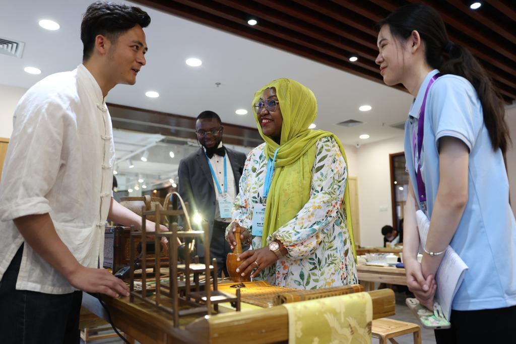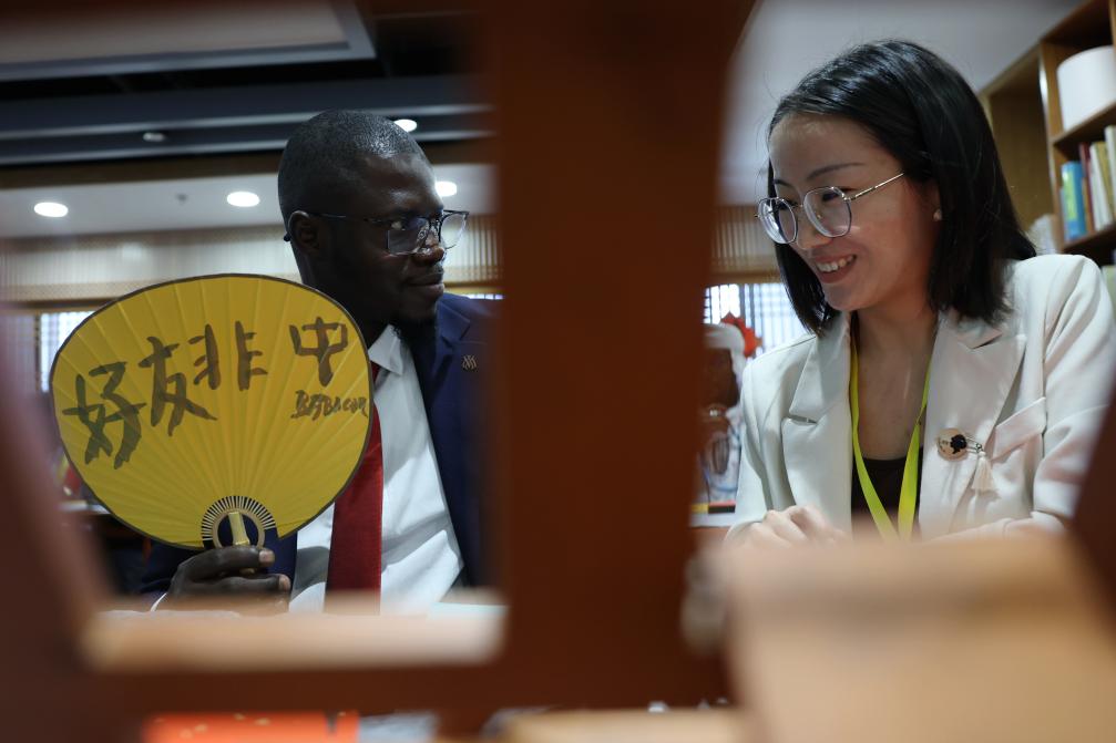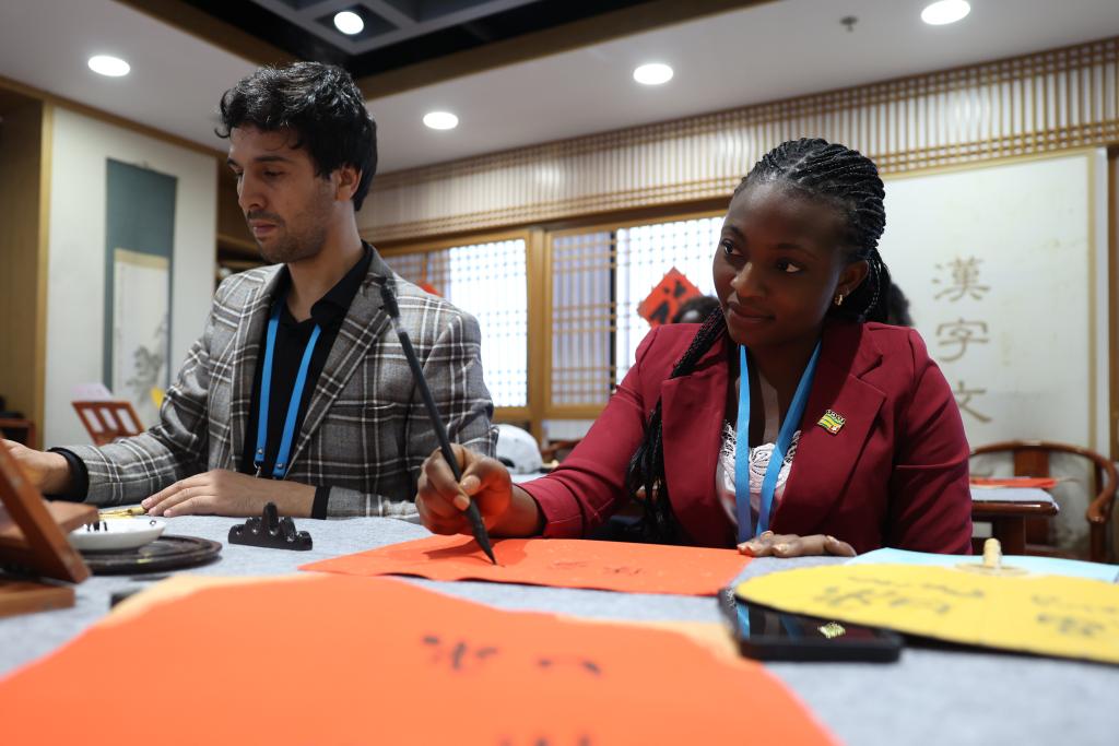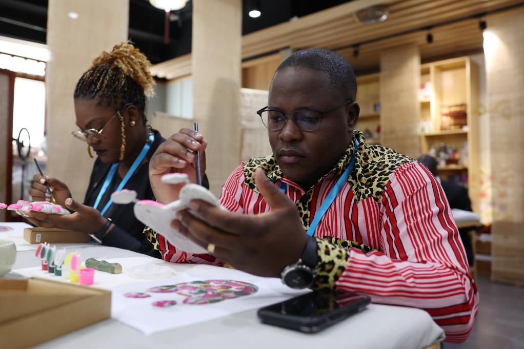 当日,参加第八届中非青年大联欢活动的中非青年代表走进位于北京的中国宋庆龄青少年科技文化交流中心,体验印染、刺绣、书法等多种民俗,感受中国传统文化的魅力,在交流互动中增进友谊。