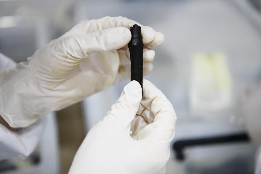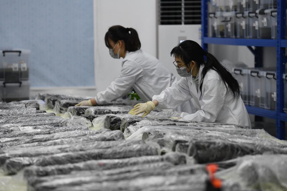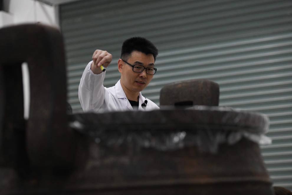 5月20日,考古人员在武王墩考古实验室进行文物保护工作。