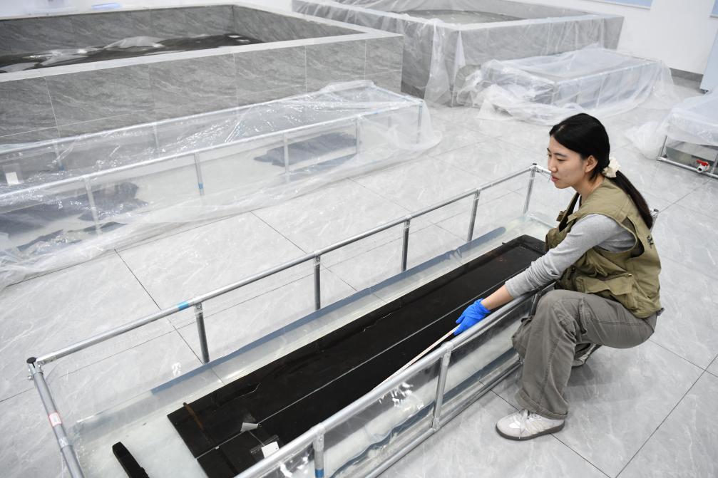 5月20日,考古人员在武王墩墓考古发掘现场清理出土文物。