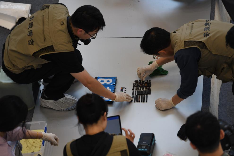 5月20日,考古人员在武王墩考古实验室清点出土文物。