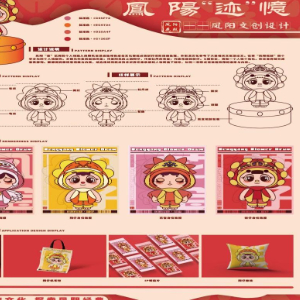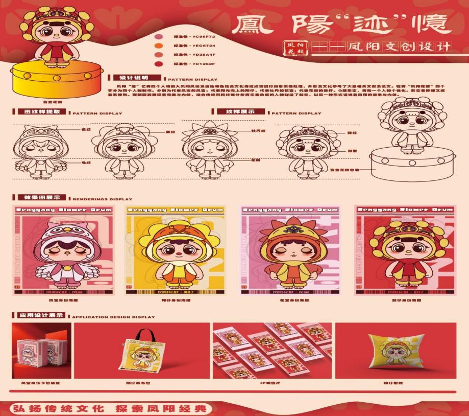 设计说明:将“凤阳花鼓”四个字分为四个人物制作:分别为代表凤画的凤宝,代表阳光向上的阳仔,代表牡丹的花宝,代表花鼓的鼓仔。Q版形态将每一个人物个性化,结合传统图腾纹饰让元素承载的人物鲜活了起来。