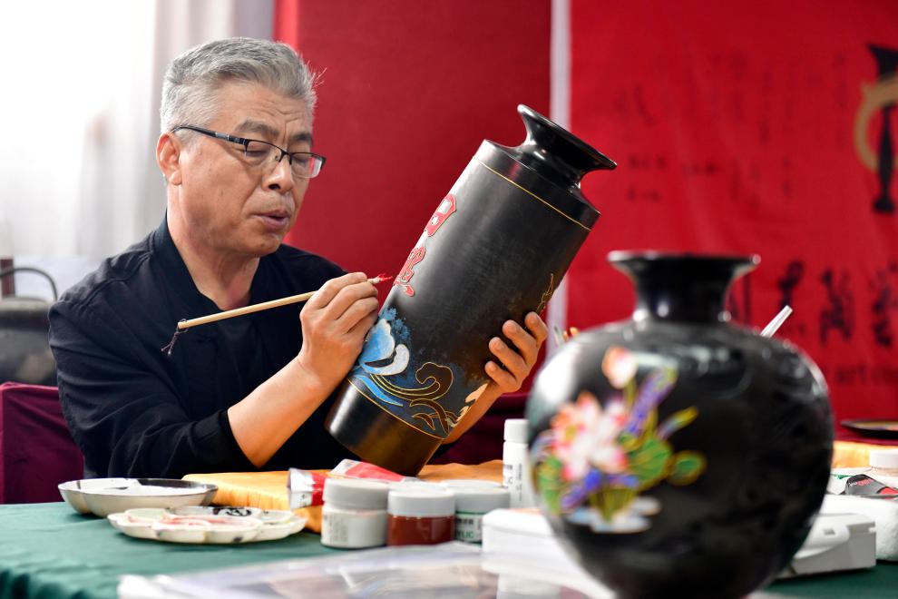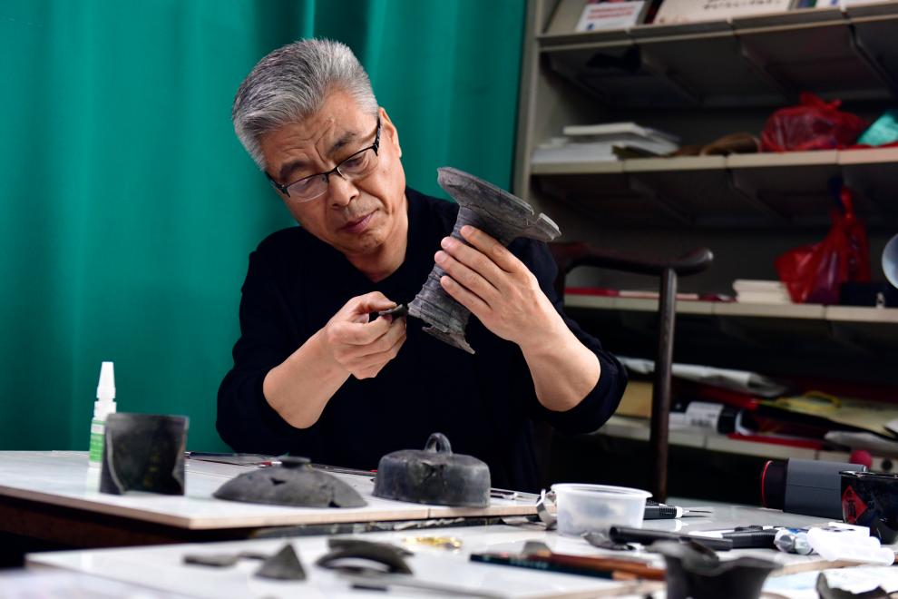 5月26日,在日照黑陶邢艺术厂,省级非遗传承人邢葆东在修复黑陶。