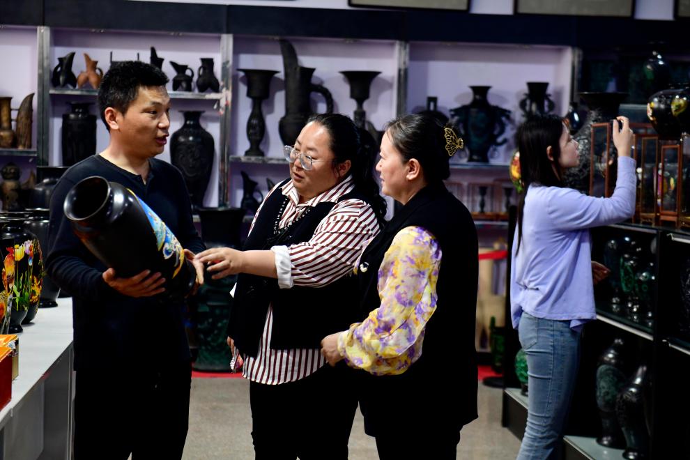 5月26日,在中国黑陶文化博物馆文创中心,顾客在选购黑陶产品。