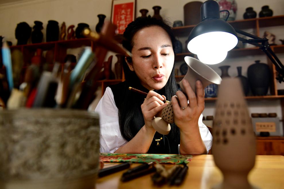 5月26日,在日照高新区慧敏非遗工作室,市级非遗传承人秦慧敏在制作蛋壳陶。