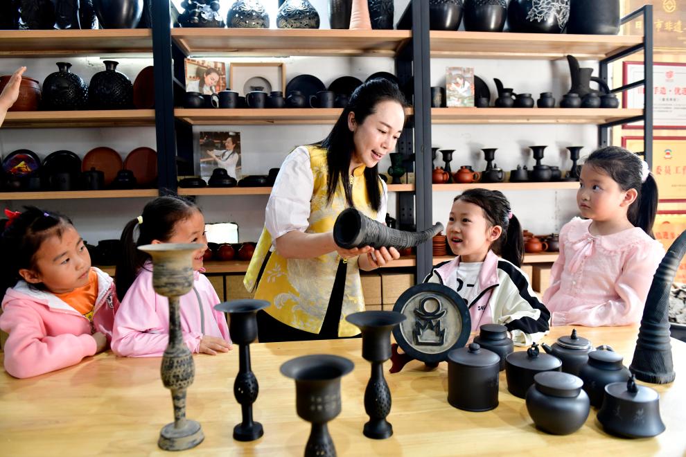 5月26日,在日照高新区慧敏非遗工作室,市级非遗传承人秦慧敏给孩子们介绍黑陶文化。