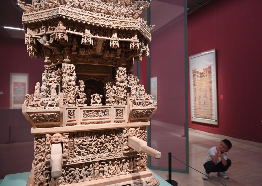 6月2日,小朋友在“何以永春”千年海丝非遗艺术展上了解闽南传统撵轿。