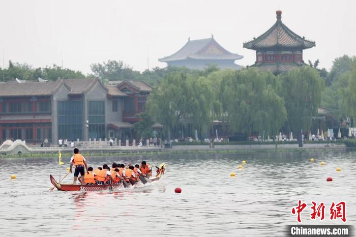 开幕式后,来自大运河流经多个省份及清华大学、北京大学、通州区、昌平区的12支龙舟队在什刹海同场竞技,仲夏争时。