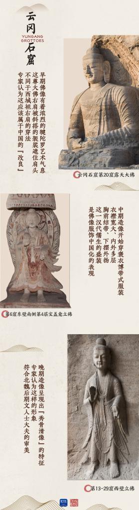 云冈石窟吞吐万汇、兼纳远近。专家认为,59000余尊造像分为早、中、晚三期,石刻造像风格的变化,展现了西来像法逐步中国化、世俗化的演变过程。