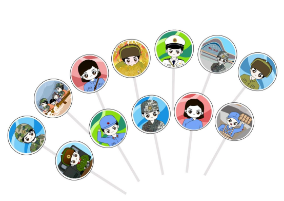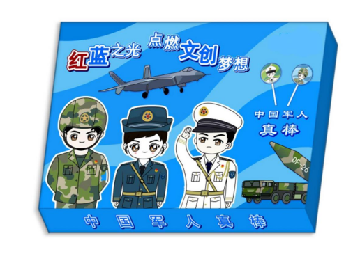 产品正面以漫画的形式绘制出中国军人在中华民族伟大复兴的进程中,飞夺泸定桥、舍身炸碉堡、抗洪抢险等不怕牺牲、不懈奋斗的身影,背面画出人民军队从红军到八路军再到如今解放军的各种卡通形象,通过独特的方式宣传我军优良传统和发展历程。实物样品为亚克力材料制作的模型,后期也可制作成食品、挂饰品等产品,让军事文创更好融入生活,让受众能把军事文化“带回家”。