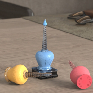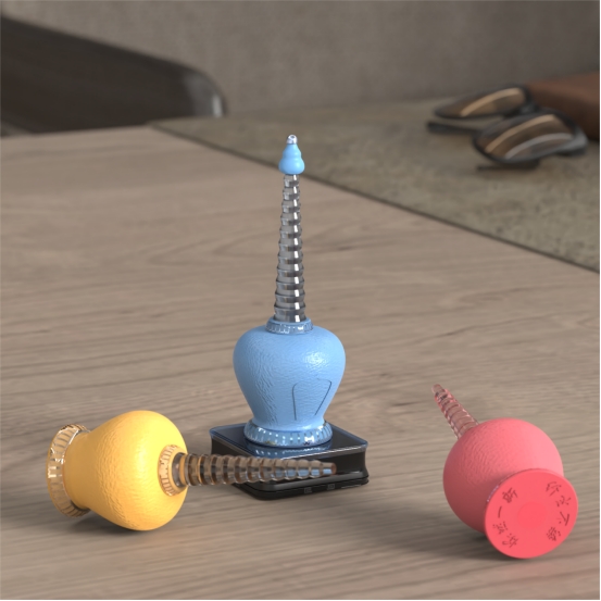 该产品以沈阳故宫清粉彩描金佛塔为原型进行设计,产品功能为吹尘球,整体结构分为上部帽扪,中部吹尘球,底部为一个无线充电设计。该作品可以采用手捏进行吸尘,也可以采用电动吸尘,当其放在底座上会自动进行充电。