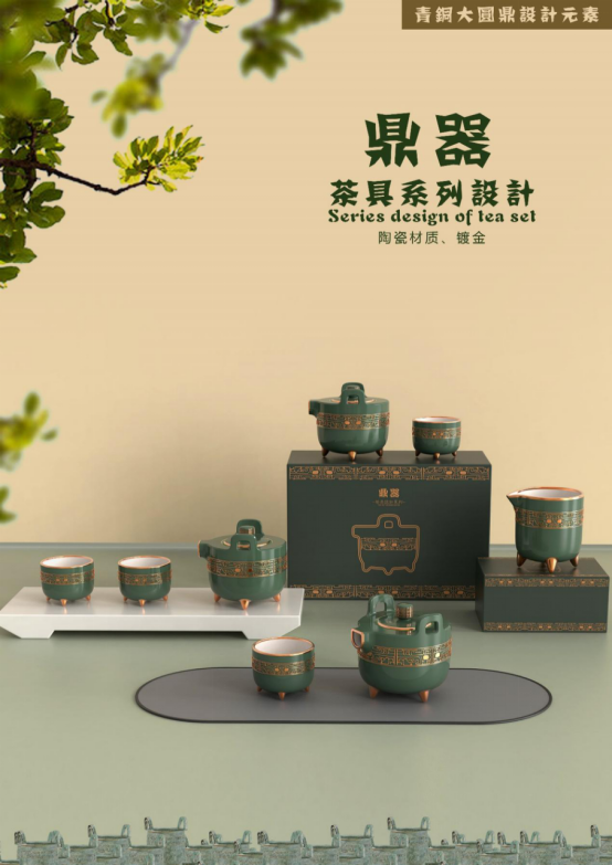 设计釆用了青铜大圆鼎里面的元素而设计的一组茶具系列设计,以沿袭和发扬青铜大圆鼎文化的时尚为宗旨,并赋予现代的审美与生活习性,使传统与现代结合。结合绿釉,营造出恬淡,悠然的设计意境,同时又不失现代的时尚理念,使人们在忙碌之余可以停下来享受器物与生活的美好。
