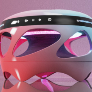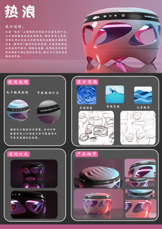 本款“热浪”主题陶瓷音响设计灵感来源于水,从水滴落激起的波纹到浪花,都在音响上体现。顶部采用水波纹式的渐消面形状隐喻水滴落的状态,腰部用了镂空的旋转造型,打破传统形态,让其造型年轻化,增强运动感,底部波浪的造型则是隐喻水滴已经形成浪花,配合灯光音乐形成强烈的节奏。