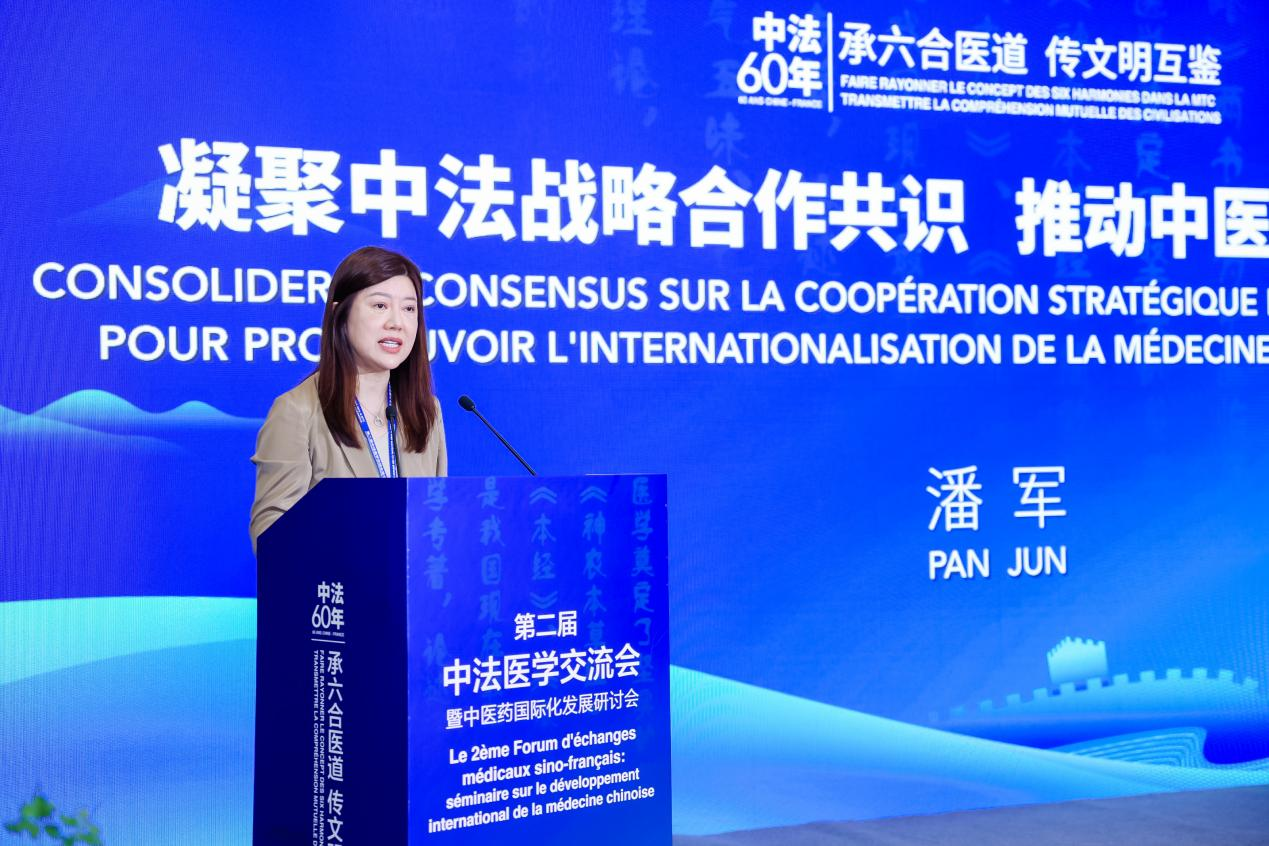 在随后的主旨演讲中,法政集团副董事长兼行政总裁、北京王府公益基金会理事长、世界中医药学会联合会埋线研究专业委员会副会长潘军以“凝聚中法战略合作共识,推动中医药国际化发展”为题,结合国际服务贸易国际化趋势和国家中医药发展规划,阐述了中医药出海战略契机,同时她还根据中医药国际传播的良好局面,以及国际卫生组织发布的传统医学在会员国的应用与临床研究数据,强调了推进全球健康覆盖和可持续发展的必要性。