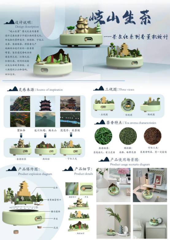 设计灵感来源于中国江西的茶文化,将茶香与产地相结合设计出的一款香薰喷雾。旨在通过香味来传递自然之美、江西之美、和谐之感,时间的流转以及生命的多样性,让人联想到小山和岛屿,回归自然。