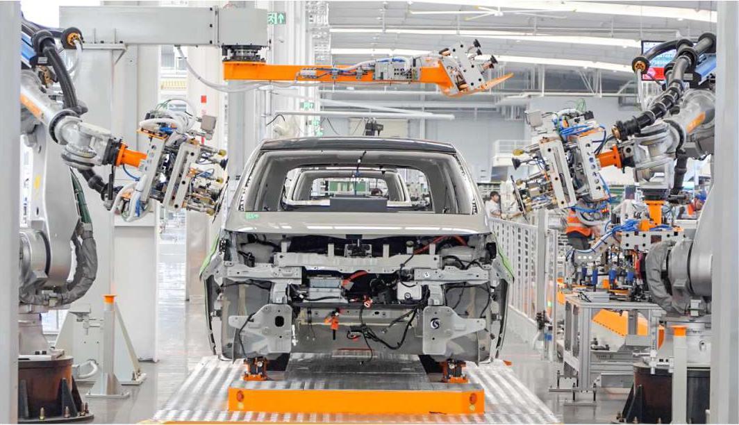 上汽通用五菱的岛式精益智造工厂,机器人参与造车。(资料图)