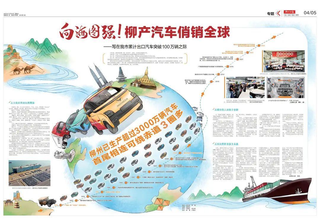 2023年12月29日,《柳州日报》刊发通版文章《向海图强!柳产汽车俏销全球——写在我市累计出口汽车突破100万辆之际》,关注柳州当下正积极融入共建“一带一路”和国内国际双循环相互促进的新发展格局之中,诚意“引进来”的同时,也潇洒“走出去”,创新求变,向海图强,让品牌叫响全球。