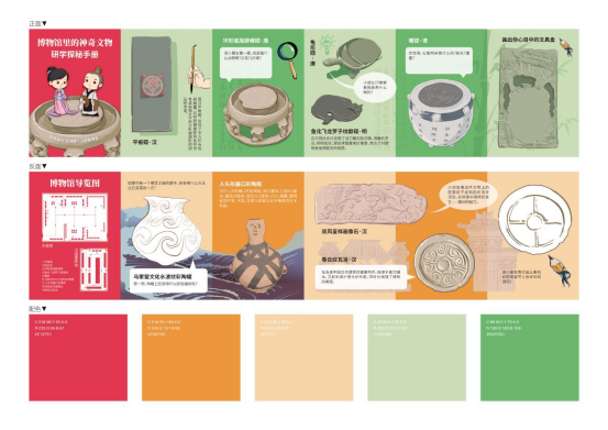 手册包含古砚、陶器、画像砖等在内的十件手绘风格的代表性文物,以及根据文物知识设置的相应问题。手绘文物在尽可能保持原貌的前提下,进行了卡通化处理。