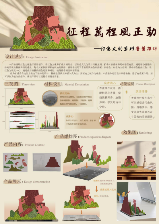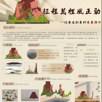 作品围绕红色文化进行设计创作,将红色文化和扩香片相结合,以红色文化为设计风格主调,扩香片在整体布局中错落有致,通过精心设计的排列呈现出和谐的感觉。