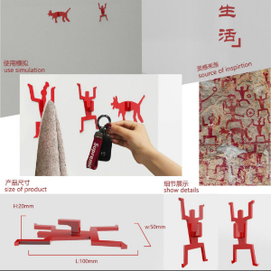 本设计旨在将花山岩画的艺术元素与现代家居生活相结合,创造出既具有文化意义又实用的挂钩产品。通过产品设计传递花山岩画的文化精髓,让更多人了解并欣赏这一古老艺术。