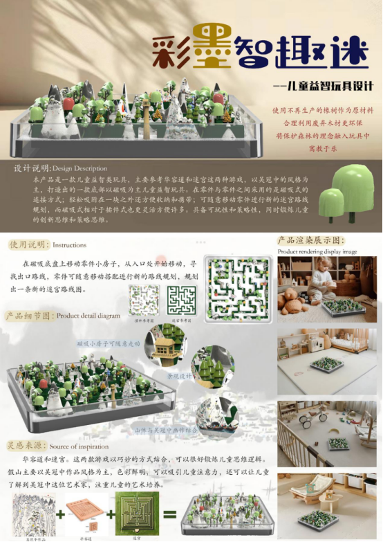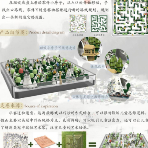 本产品是一款益智类玩具,主要参考华容道和迷宫这两种游戏,假山以吴冠中的作品风格为主,打造出的一款益智玩具。