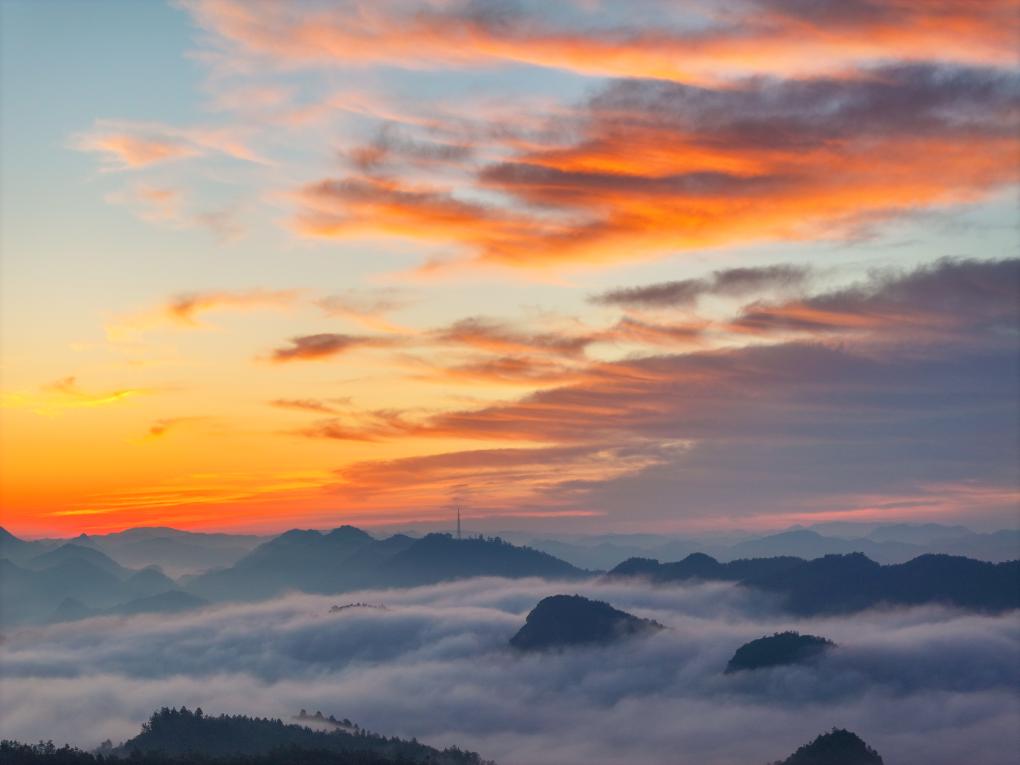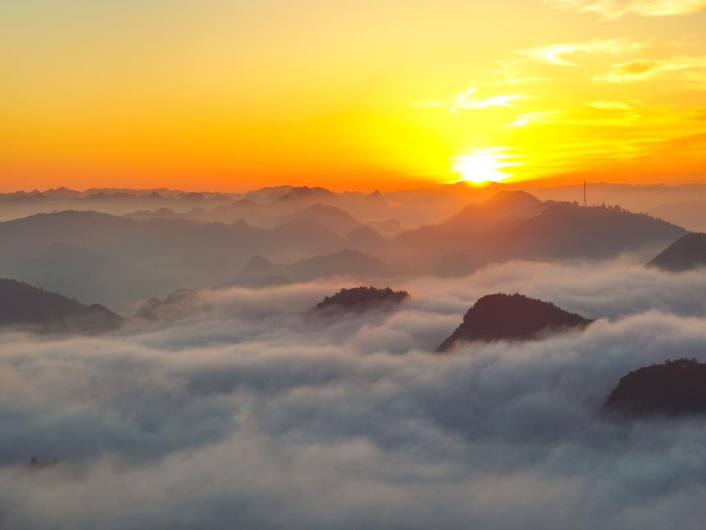 连日来,贵州省毕节市七星关区倒天河水库出现壮美的日出云海景观。清晨,一轮红日冉冉升起,金色的阳光洒落在树林间,晨雾如轻纱环绕,山峦在云海之上若隐若现,仿佛一幅动人的水墨画,美不胜收。