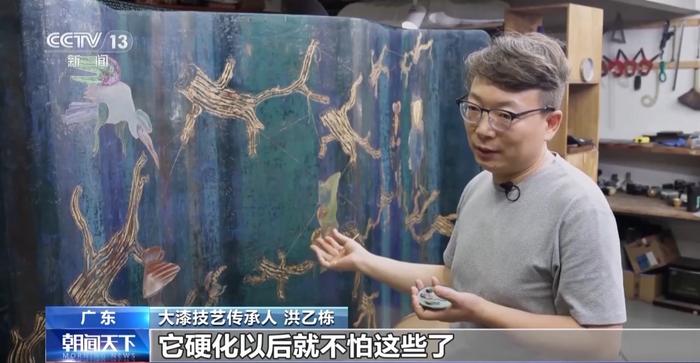 在广州南沙区的一个创意园内,一幅大漆屏风的创作进入收尾阶段,洪乙栋正全神贯注,拿起手中的画笔不时添上几笔。