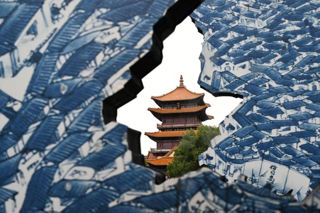 细雨中,龙珠阁前破碎的青花瓷片旁,依然聚集着排队拍照的人群。照片里,从缝隙中显露的龙珠阁姿态各异,游客们相互对比,面露欣喜。
