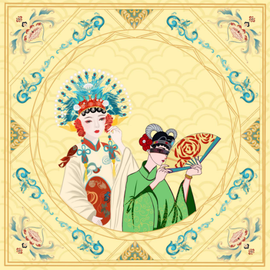 运用了京剧元素以及窗花的对称元素,可用于丝巾和其他周边设计。色彩搭配借鉴了敦煌壁画的色彩,同时也结合了一些未来的元素,有赛博未来与传统的碰撞。在外轮廓上选取了一些北京传统的纹样,进行画面丰富,京剧人物头饰也使用了中国的国花牡丹,以及凤凰鸟等元素,还在底部添加了一些暗纹增加画面的层次感。