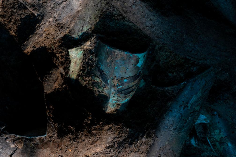 这是在三星堆遗址考古发掘现场3号“祭祀坑”拍摄的青铜面具。新华社记者 沈伯韩 摄