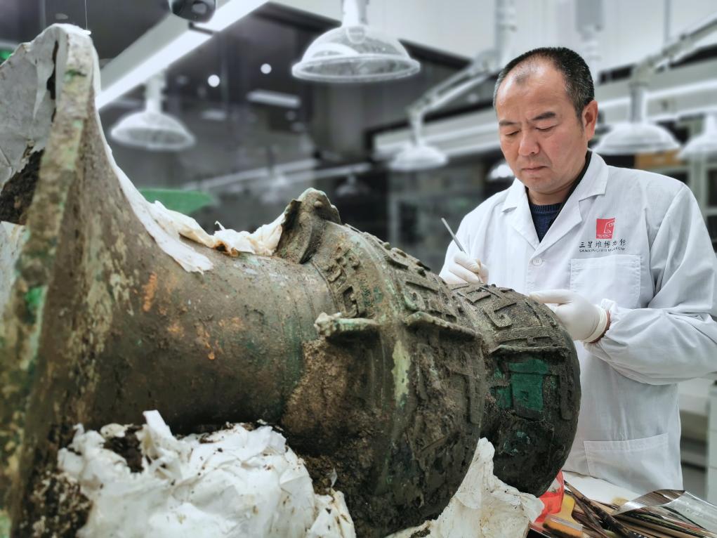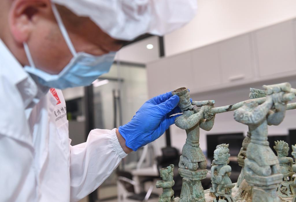 郭汉中在三星堆博物馆文物保护和修复中心清理大口尊 资料照片