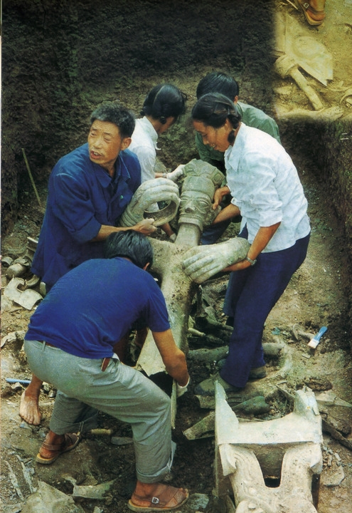 1986年,青铜纵目面具和青铜大立人都是出土于三星堆遗址二号祭祀坑。青铜大立人被发现时已经断成了两截,下半部分更是被氧化得十分严重,已经承受不起大立人的重量了,最后是通过内加固的方式来修复,才得以呈现在现今的观众面前。