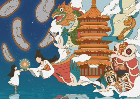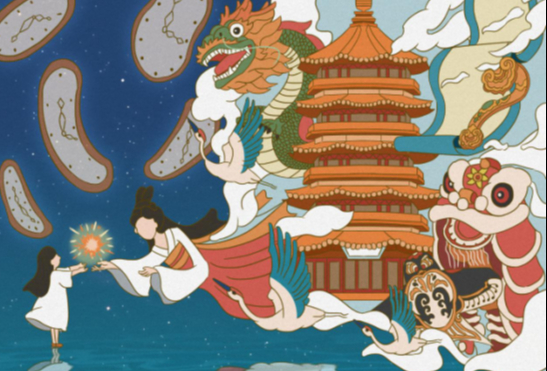 这副插画描述了一个跨越时空的故事。画面的小女孩代表了现代的中国少年儿童,她站在时间的空间里,这个空间象征着历史与现实的交汇点,也代表着传承与创新的桥梁。