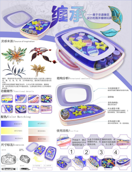 这是一款以非遗缠花为设计灵感,为启智学龄儿童而设计的海洋玩具,从小培养孩子们的环保意识。