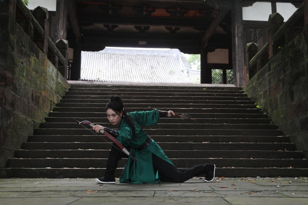 峨眉山市往北约两公里的飞来岗上,坐落着一座依山而建的大庙飞来殿。十来名身着“峨眉青”劲装、手持峨眉剑/刺的妙龄女子步履匆匆,径直推开厚重的朱漆殿门,眼前一殿高过一殿,竟别有洞天。一直抵达最深处的清虚园,这群侠女才散开,各自演练起来,声声娇叱瞬间刺破了青山翠谷、广宇古刹的幽静。剑气纵横,拳拳生风,一招一式似柔实刚,恍如峨眉派重现江湖,又似一幅鲜活的水墨画。