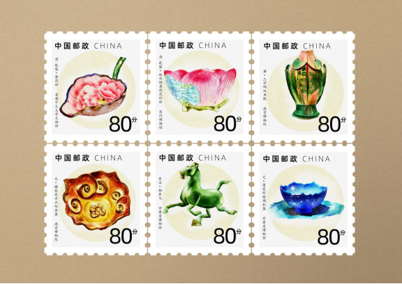 整套设计选取国内各大博物馆藏品,或镇馆之宝,或颜值担当,用华丽的水彩渲染,把古代文物因岁月褪色而尘封的美貌,重新绽放于世人眼前。此“时光凝彩”文物邮票系列共20张,精心选取故宫、国博、南博、甘博、杭博等博物馆藏品进行绘制。